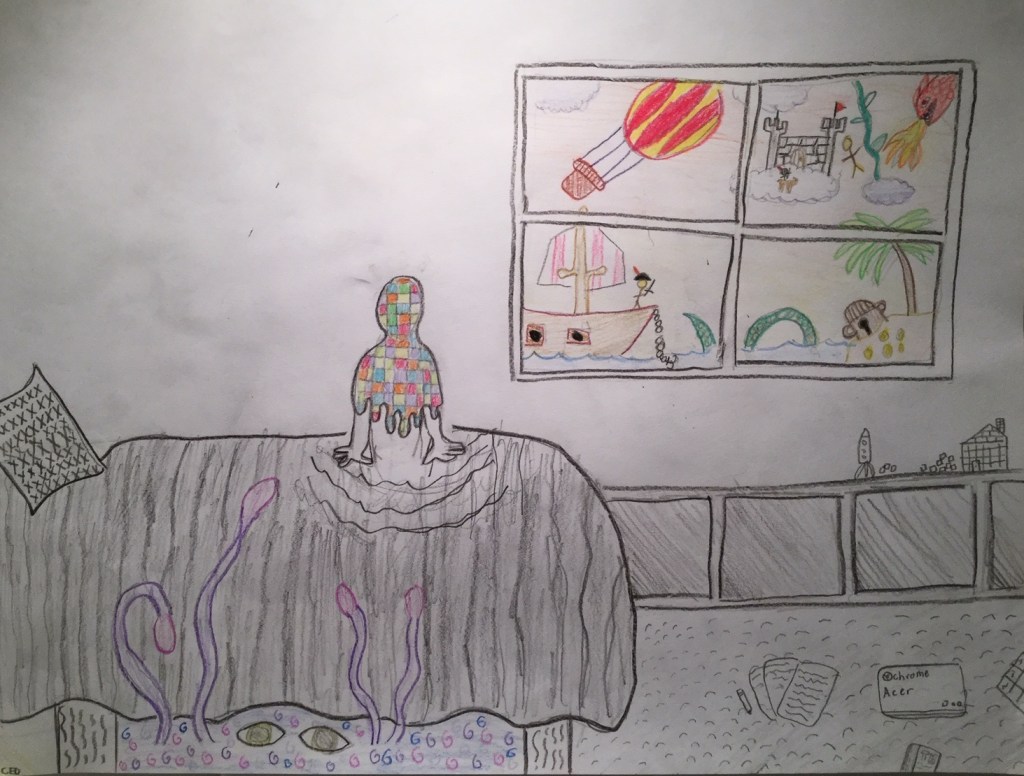 Some of the inspiration for the piece is how I’m feeling. The Gray and black and white represent me being bored and kind cut off because I don’t get to see any of my friends besides google meets. And when I’m bored I like to imagine things so the colorful window represents all of the opportunities that imagination holds. Even what’s lurking under the bed…