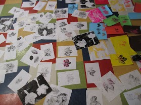 Elementary artists are introduced to contour drawing with the help of the various types of leaves I collect that morning. Note that leaves don’t last longer than a day inside so my collections were frequent and fresh for each art experience (if time is on your side, a quick trip outside will allow students to scan the local harvest and choose a selection of inspiring material). Students carefully observe the curves, dips and sharp angles that form the edges of the soft delicate forms and use black felt-tip pens to draw their observations. Students soon noticed the texture found on the underside of the leaves and inquired about what they saw. We discussed how veins bring nutrients to all areas of a leaf’s surface and made a connection to the veins in our own bodies and discussed how they carry blood and oxygen to every part of our body. Texture was further explored through leaf prints using black ink on white paper. Students discovered so much more about the details and patterns found in leaves when they observed the textures that the process of relief printing offered to the naked eye.
