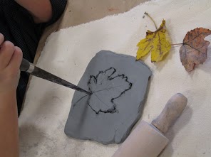 Leaf prints in clay (clay, rolling pin, clay knives, colored underglaze, clear gloss glaze) learn more here.