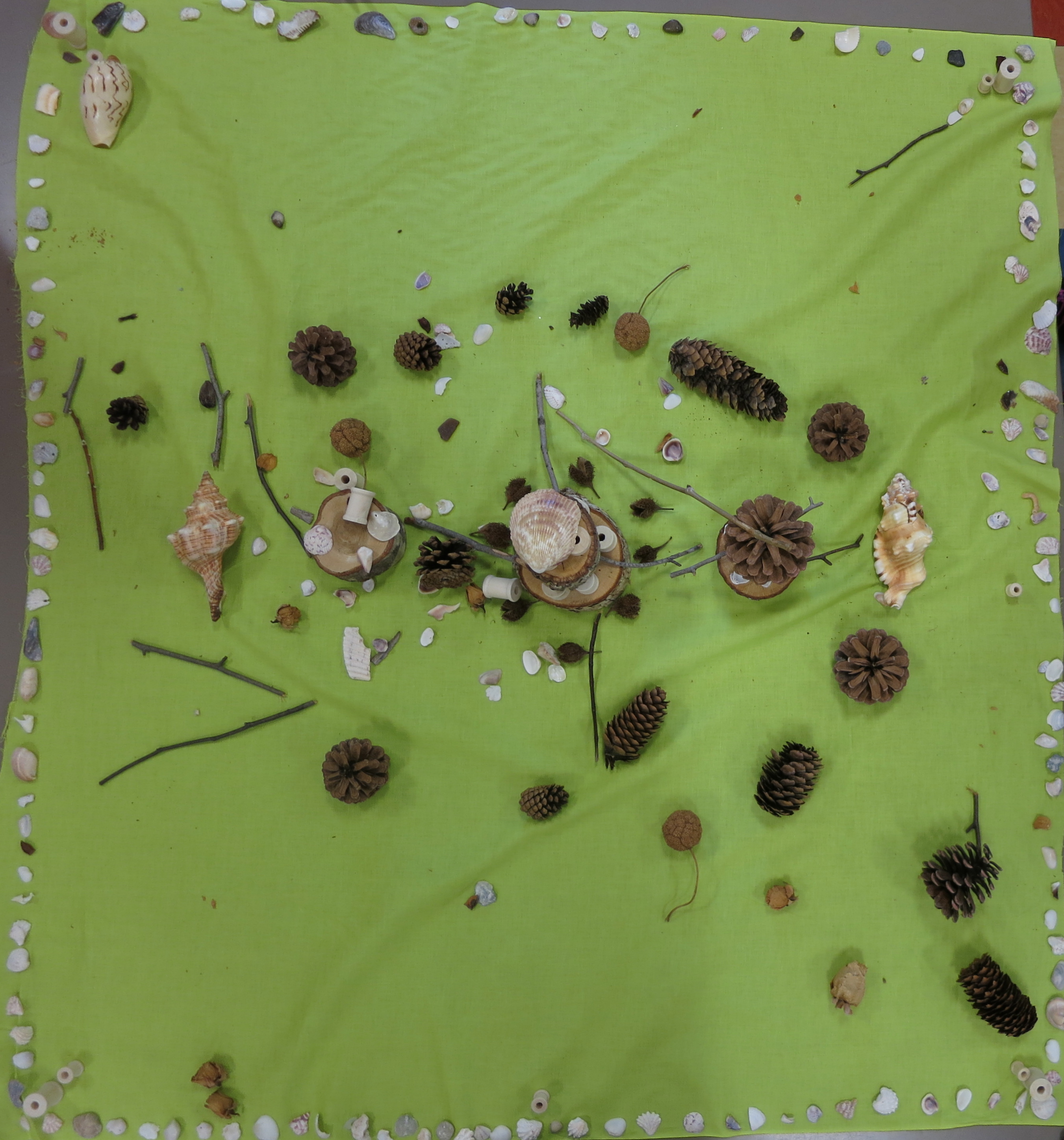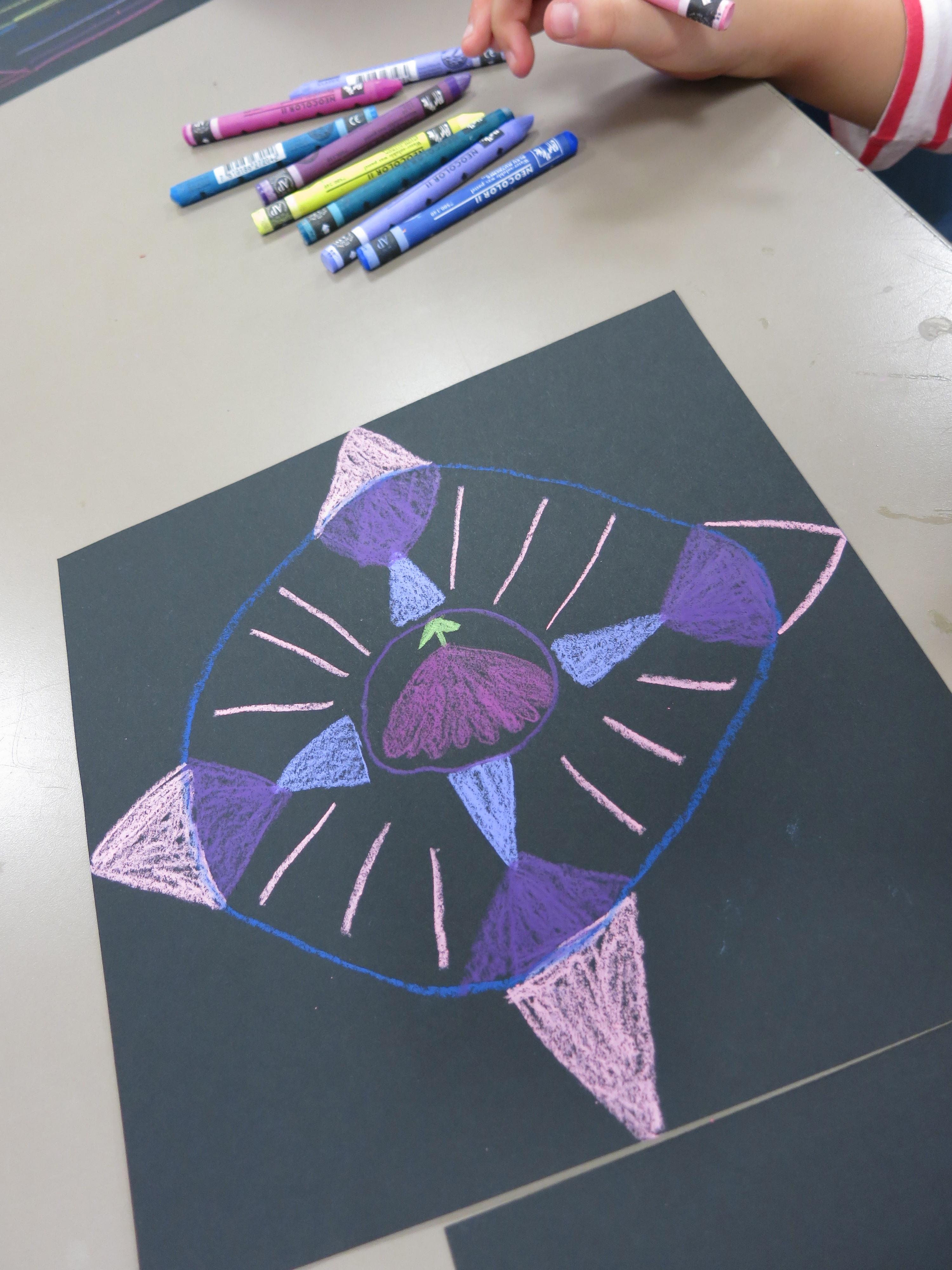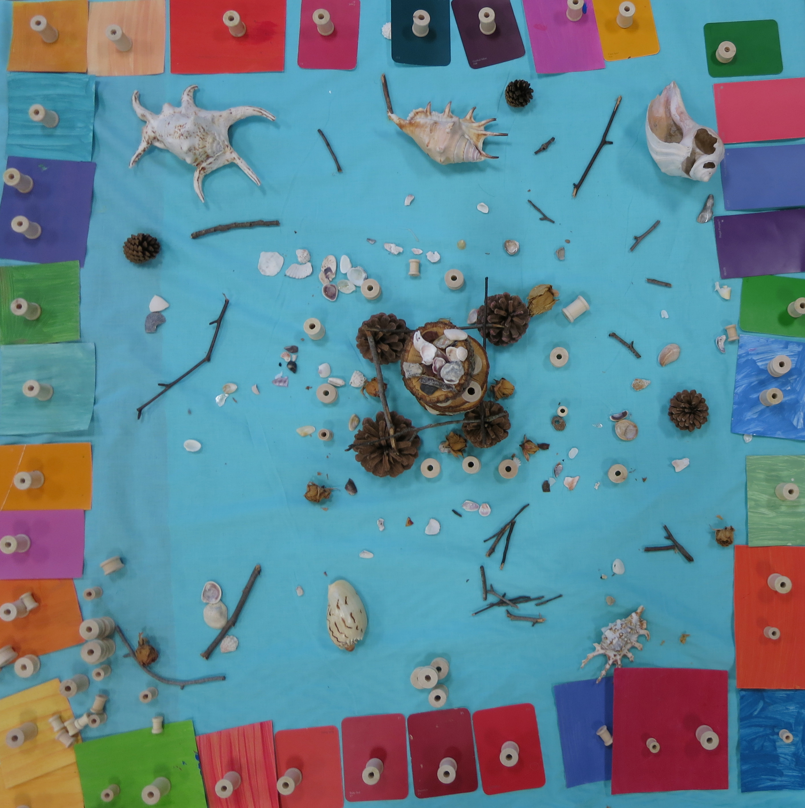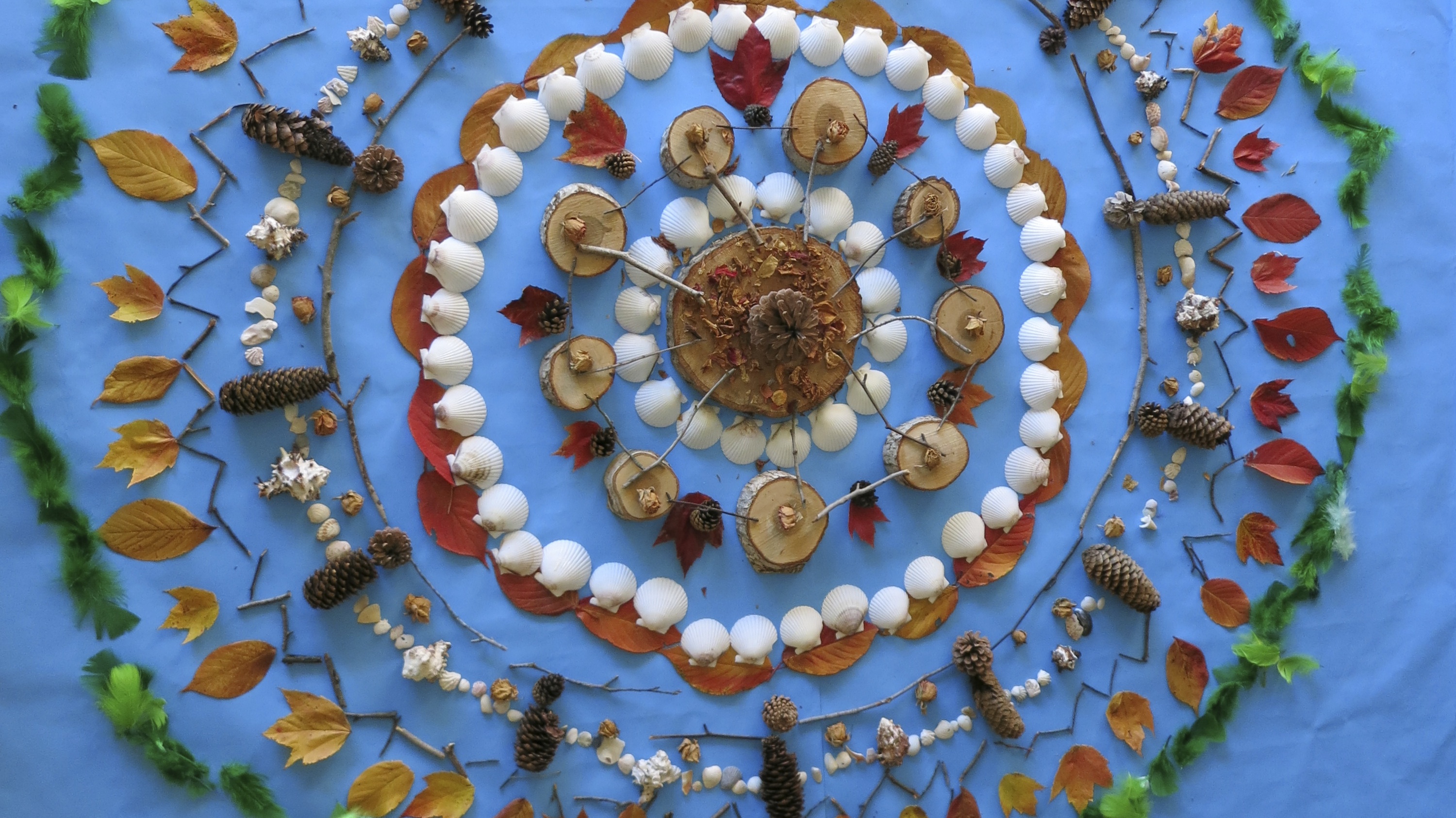 After learning so much about Diwali, we were inspired to create our own Rangoli in the art studio. Traditionally colored sand and glitters are used to create these symmetrical assemblages, but we decided to use nature (and a few artist-made objects too).