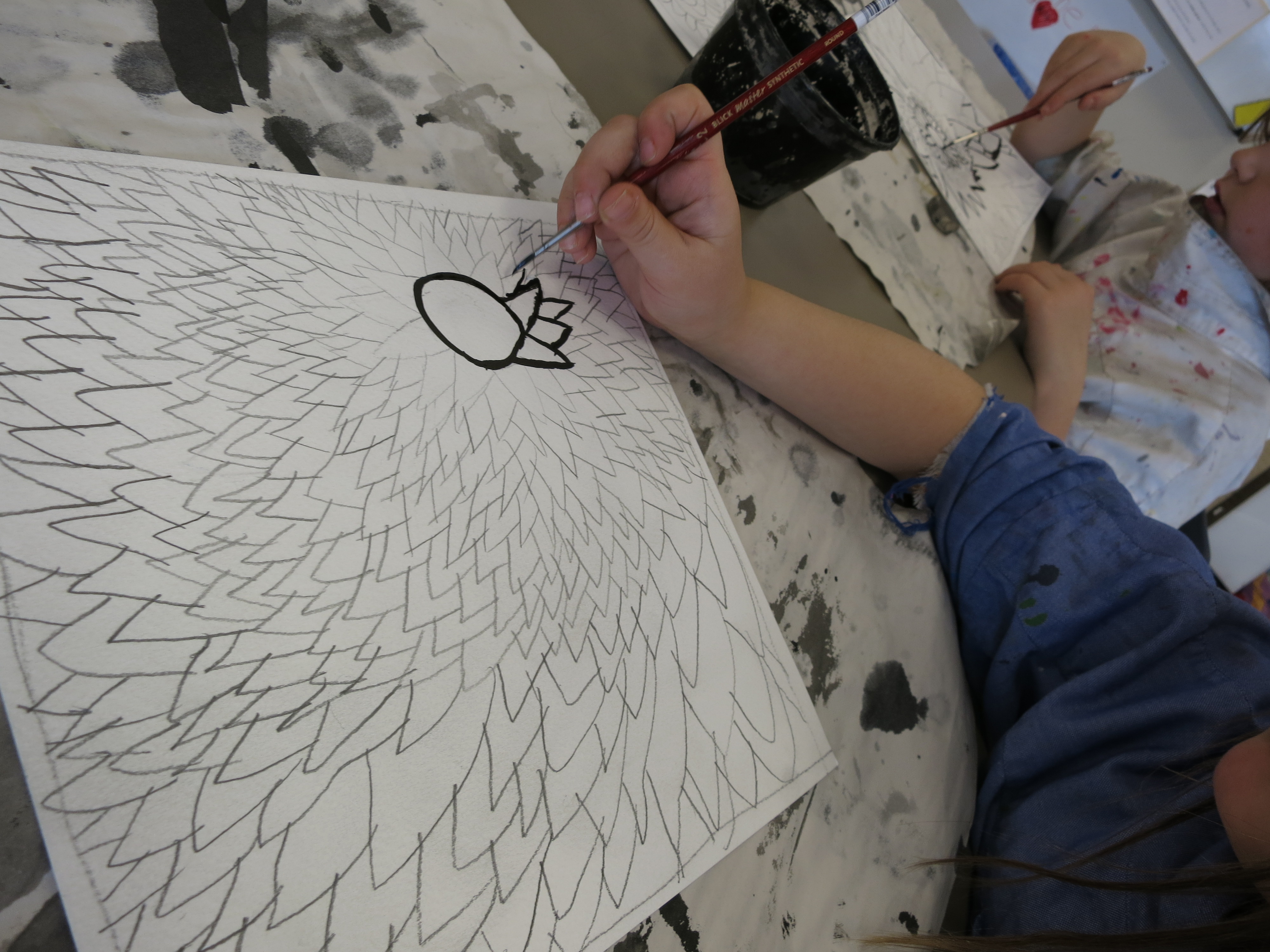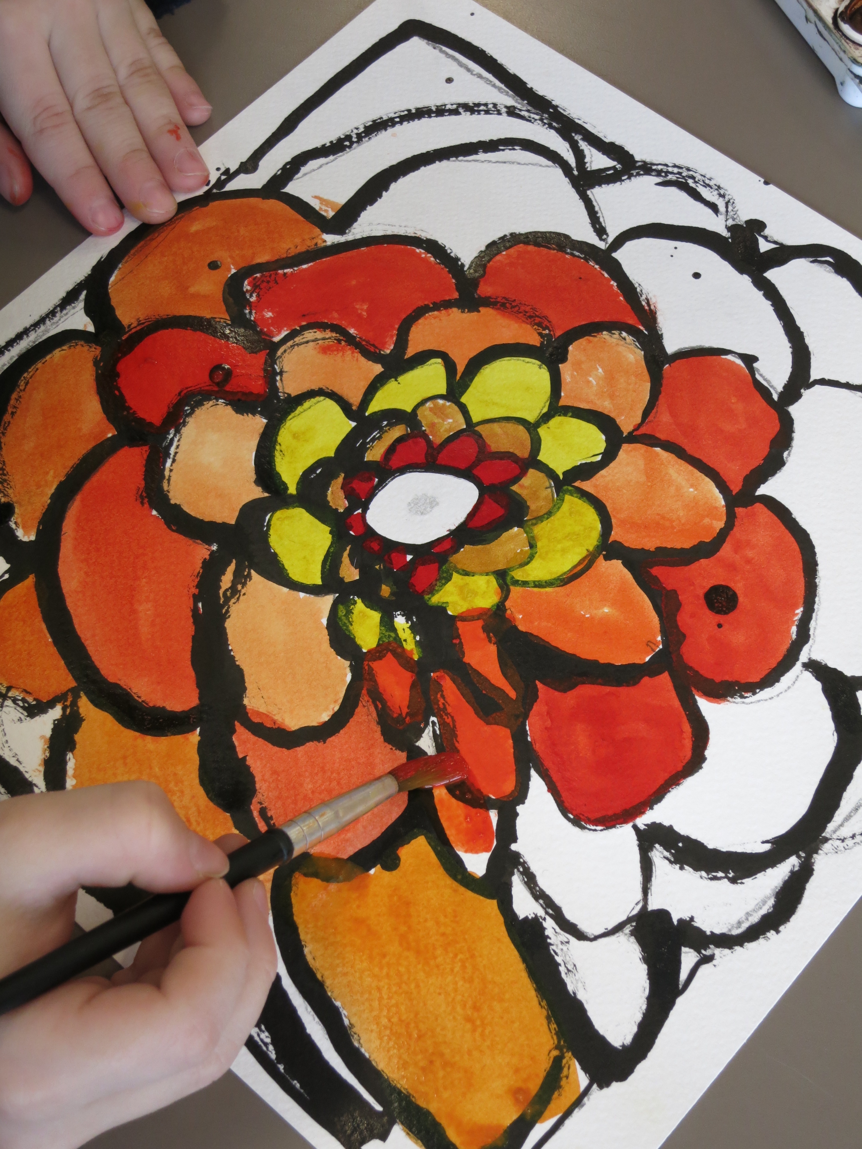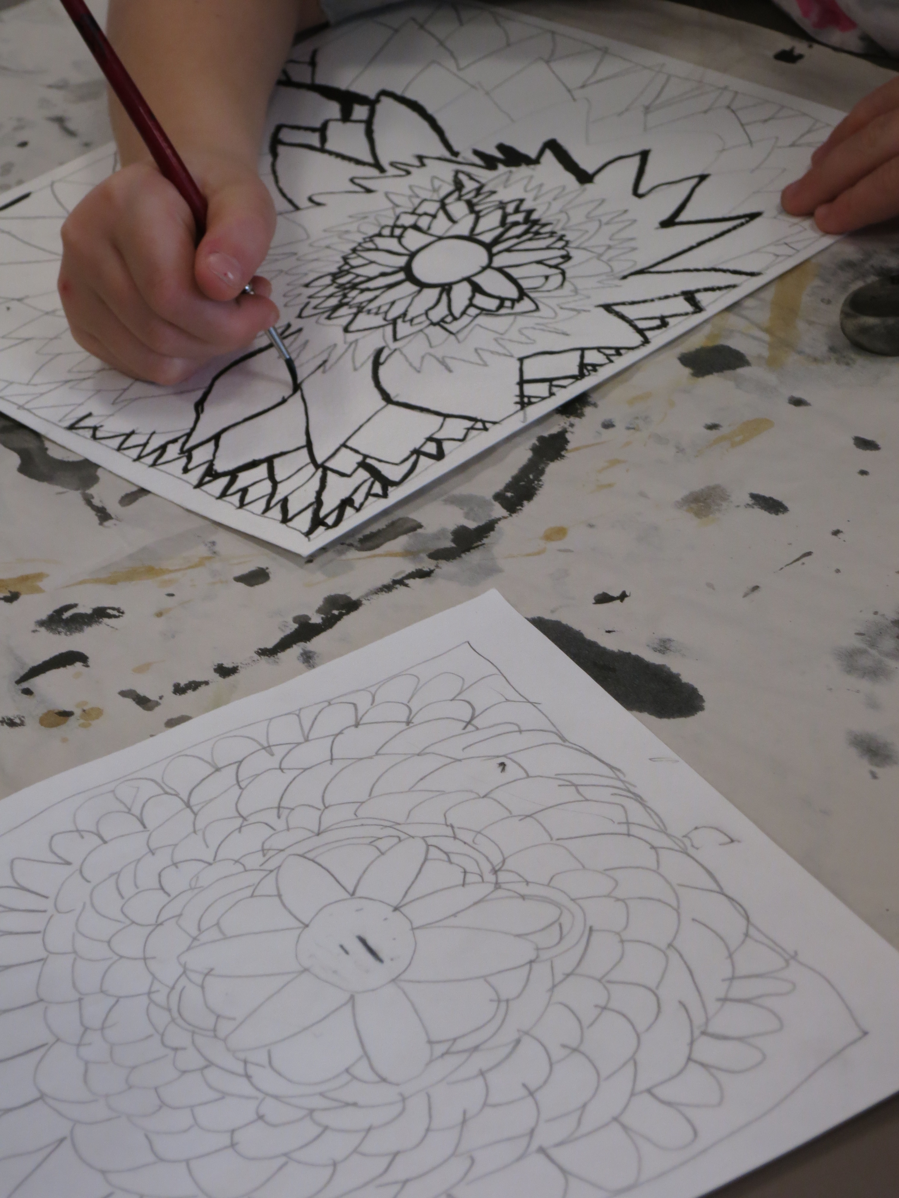 We used ink to make our drawing more defined. We work slow and practice mindfulness when using this permanent material.