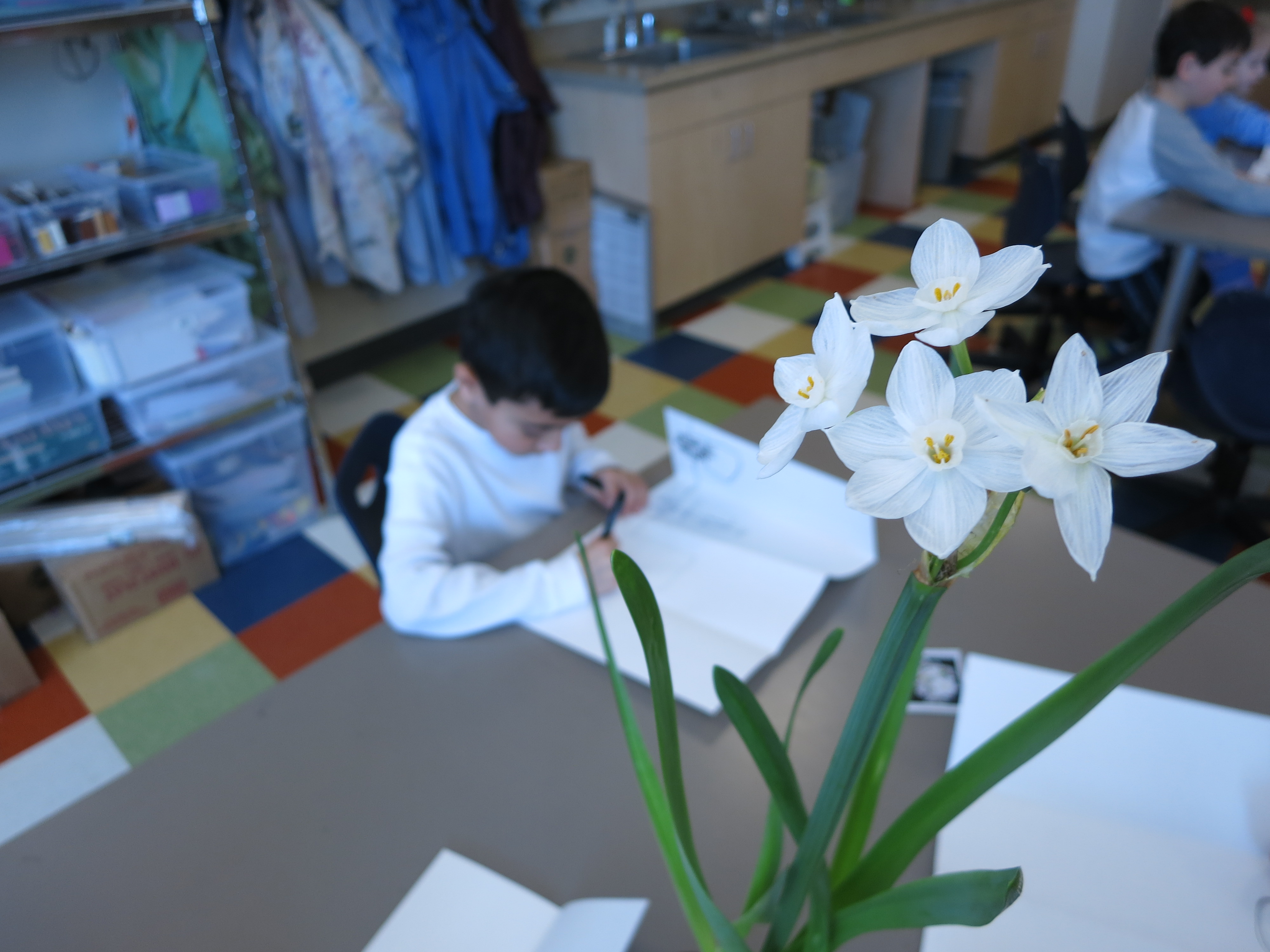 While observing the life of a paperwhite for a three week period of time, students documented the growth through time-lapse photography as well as observational drawing. Students looked closely and created a contour line drawing each week for three weeks in an accordion-style book and wrote about their observations.