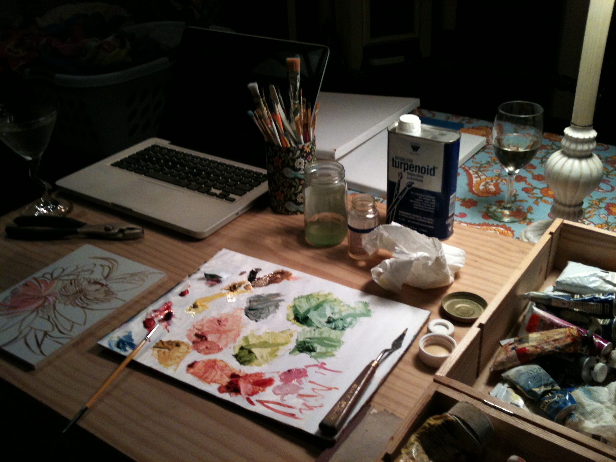 My painting session consisted of Gerry Rafferty Radio on Pandora, delicious colors that felt like butter while mixing and an ice cold martini. Thanks, Nicky.