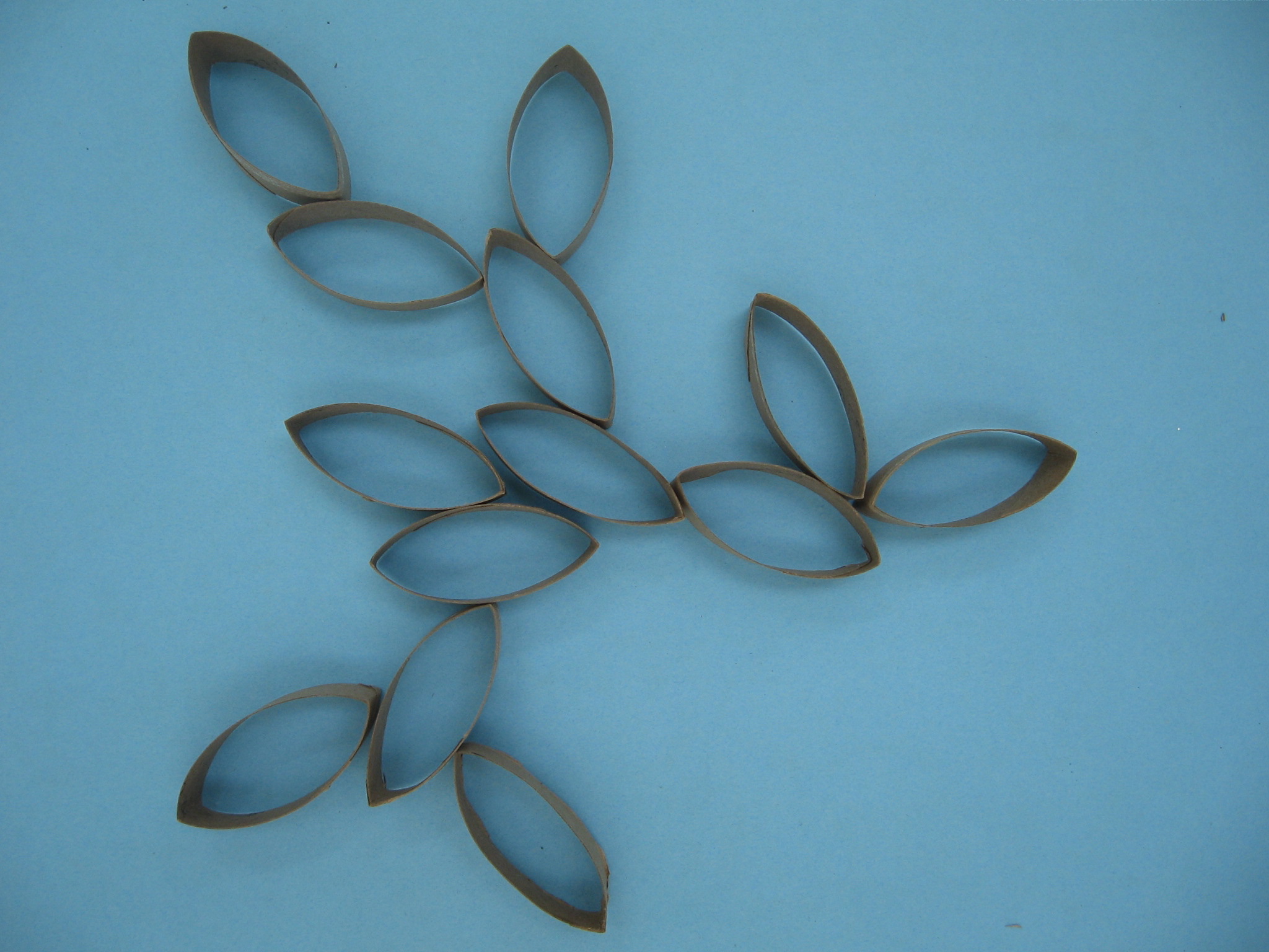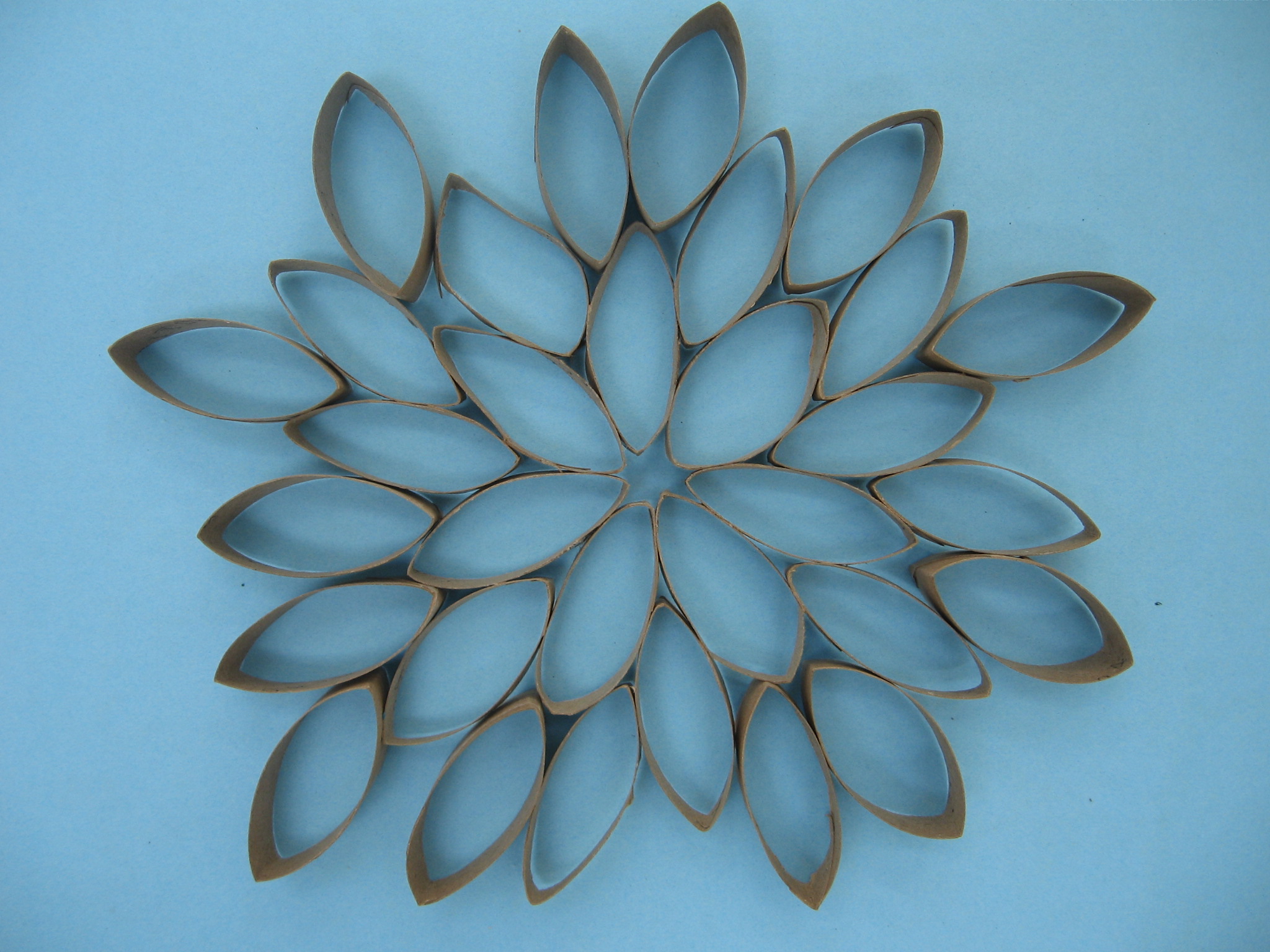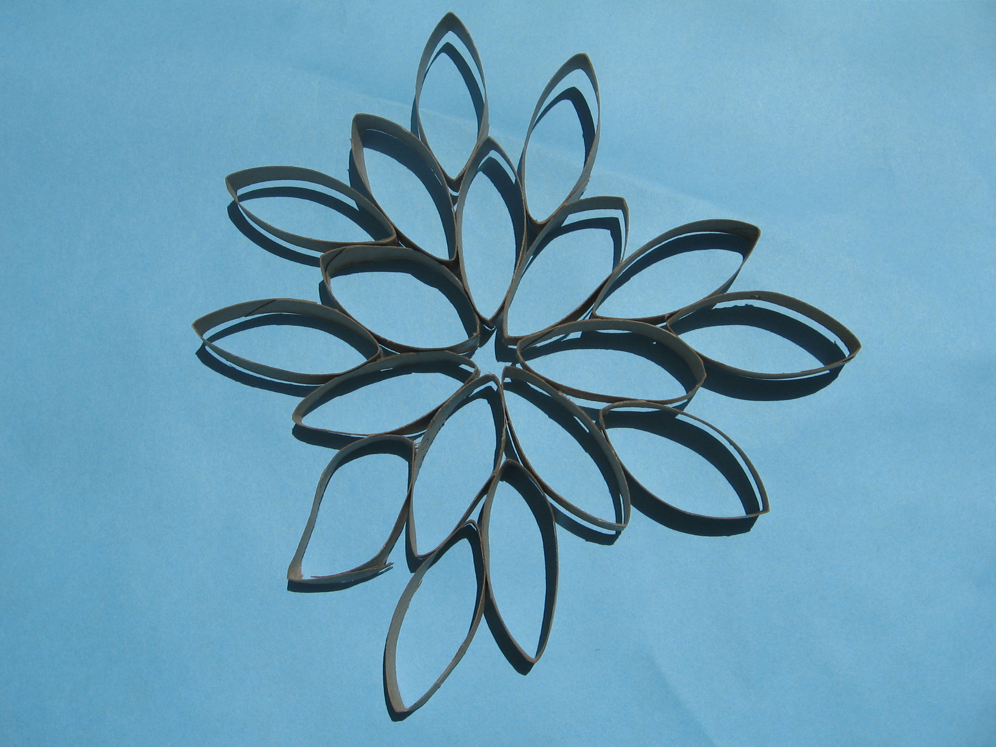Once you have a collection of sliced pinched oval shapes, start laying them out on a large, flat surface in a branching pattern of sorts or a giant zinnia shape starting with a design in the picture above or another design that your imagination might invent! My vine above was made from only 1 paper towel roll. You will have many more ovals to arrange if you cut more than 1.