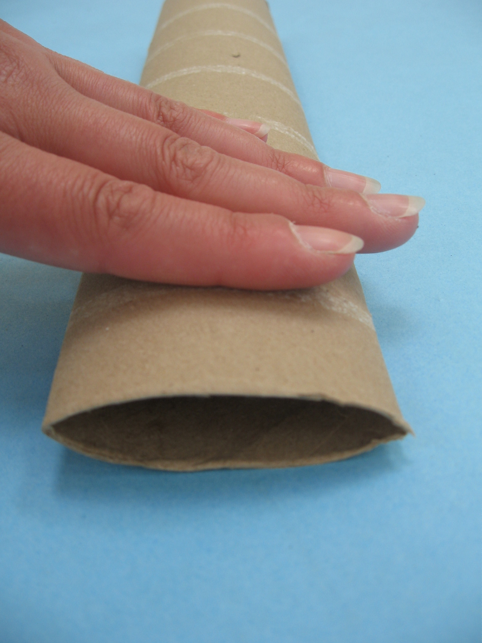 Press down on the paper towel rolls. It should look like someone sat on it and flattened it a bit. The open circles on either end will now look like a pinched oval.